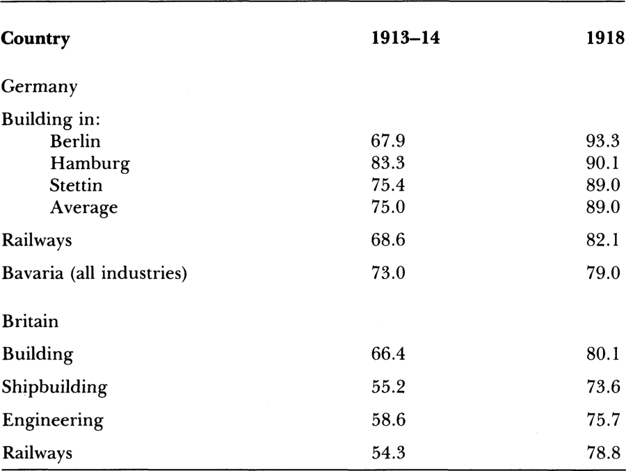 It is well known, for example, that the most prominent activists in all countries were the metal and munitions workers.37 Yet because they were deemed essential to the war effort, these were the most favored group of workers, and their wartime earnings rose accordingly. Austrian metal workers received special wage supplements subsidized by the state beginning in June 1918; their English counterparts had received a bonus one year earlier.38 In Germany the wages of men in the war industries were almost 40 percent higher, relative to prewar levels, than those available to workers in civilian industries.39 Roughly the same situation prevailed elsewhere in Europe, as the demand for steel, iron, ships, and guns intensified.40 Nevertheless, these “aristocrats of labor” formed the industrial vanguard of the militancy. Just what other forces propelled them to leadership we shall soon see; suffice it to say here that poverty was not of primary importance.